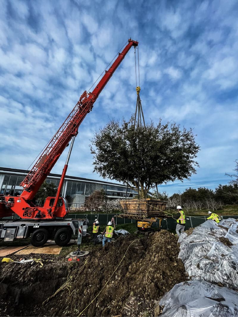 We provide expert tree transplanting solutions for large-scale commercial projects, ensuring the seamless integration of mature trees into modern landscapes, like when we successfully transplanted a massive oak tree at the Apple Campus, preserving its beauty while blending it into the cutting-edge design.
